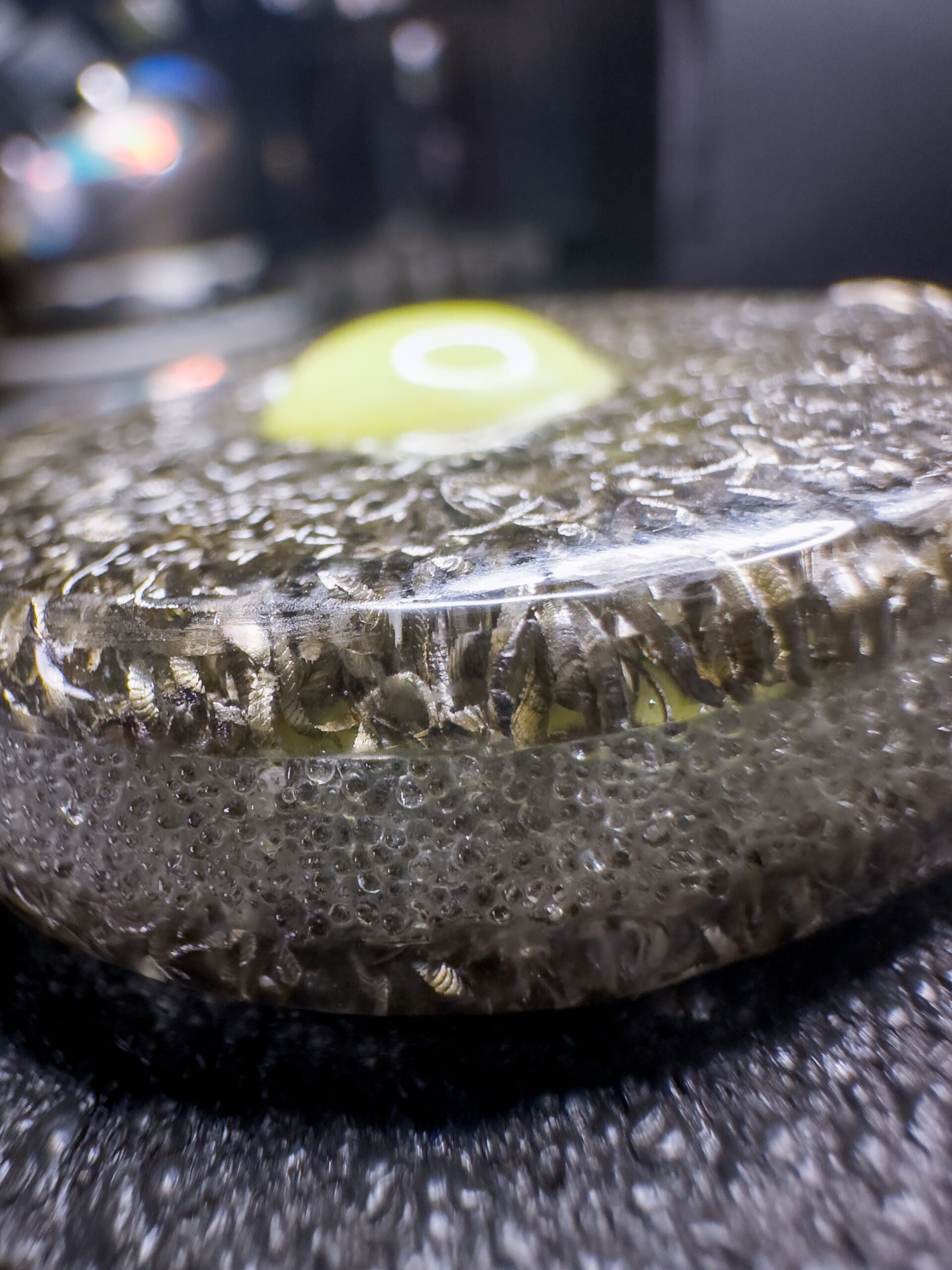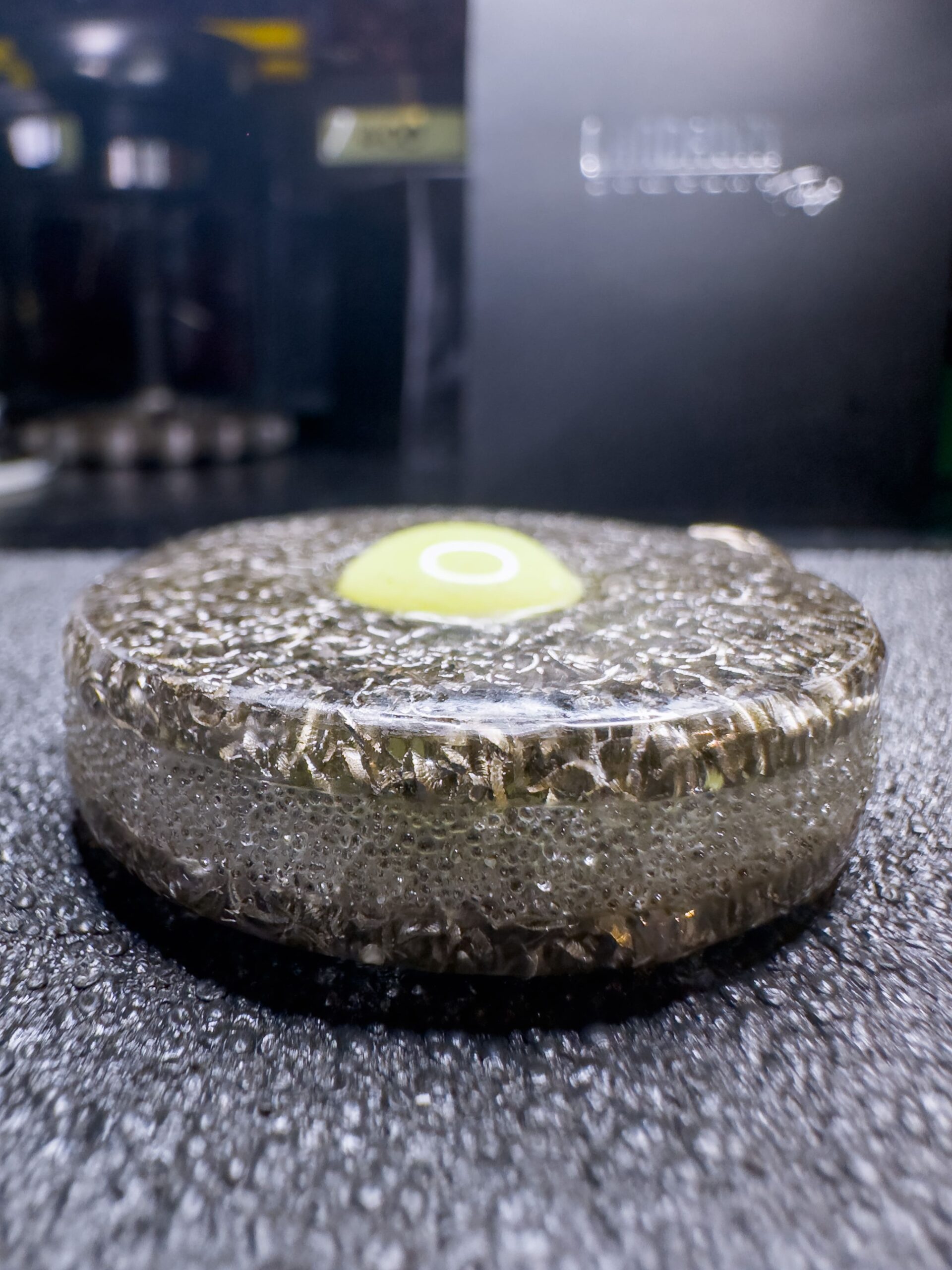 E non รจ tutto. Uno strato riempito di microsfere di vetro collocate fra le due facce, visibile lateralmente, ne valorizza la luminositร , trasmettendo a questo gioiello una sensazione di energia racchiusa.