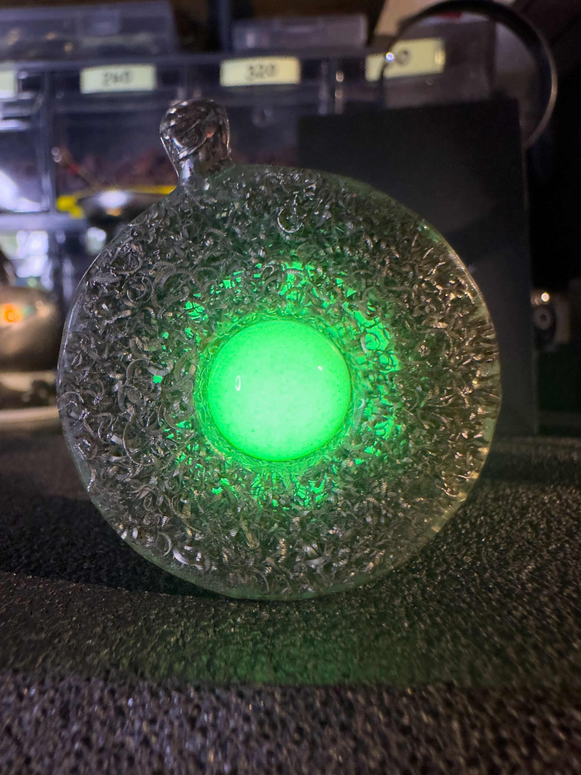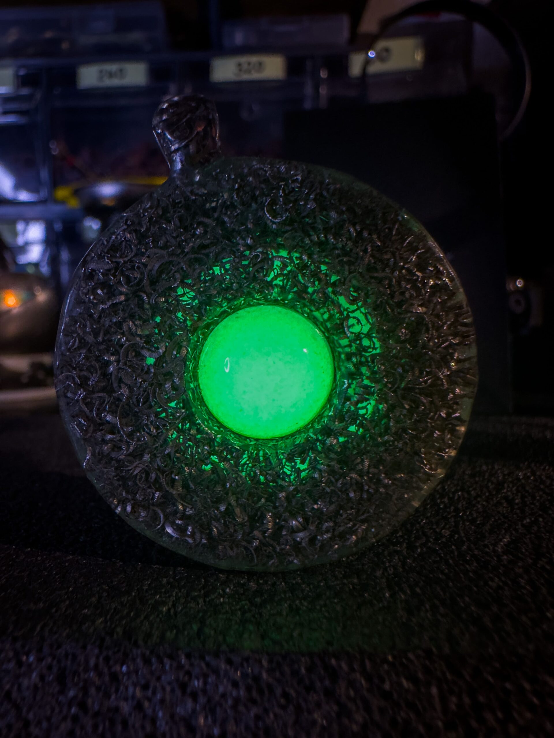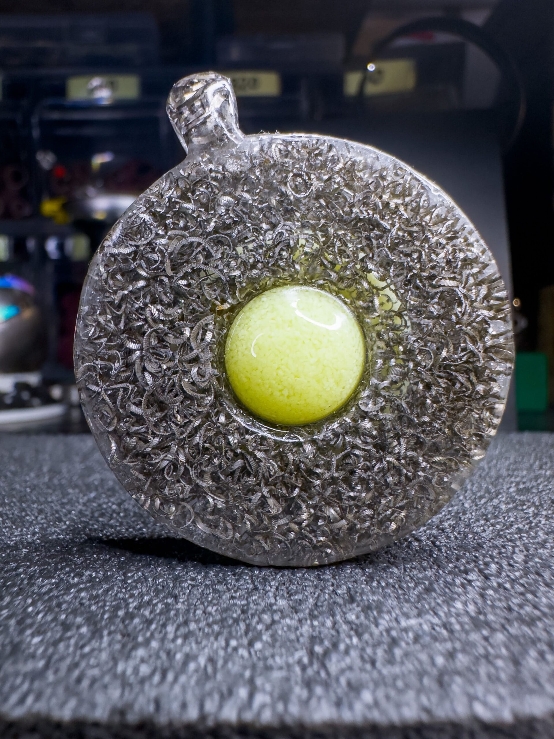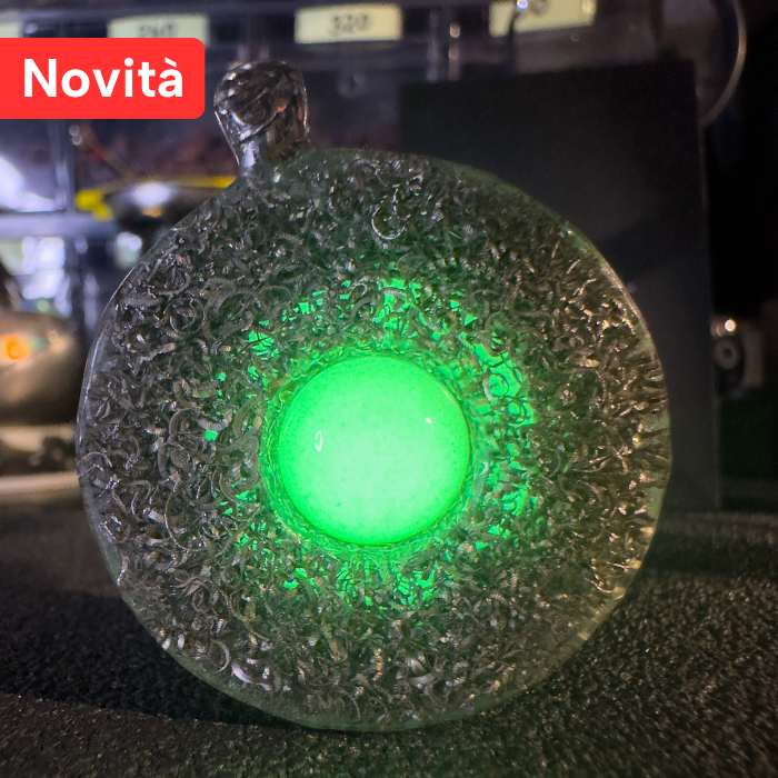Le due facce del ciondolo, realizzate con truciolo di acciaio Damasco compresso e resina epossidica, custodiscono al loro centro, una sfera di frammenti fosforescenti gialli che si trasformano in un verde intenso al buio, catturando ogni sguardo.