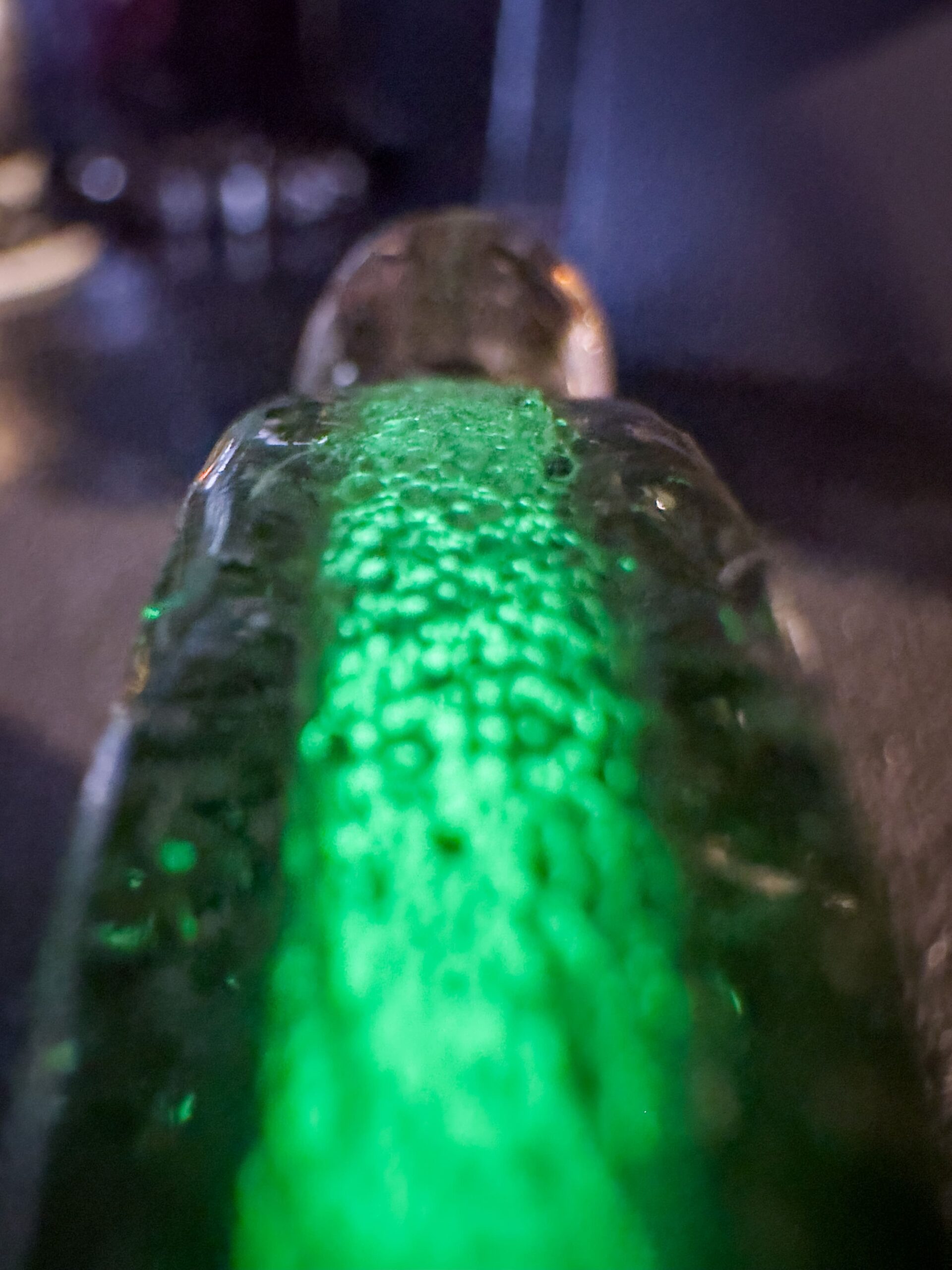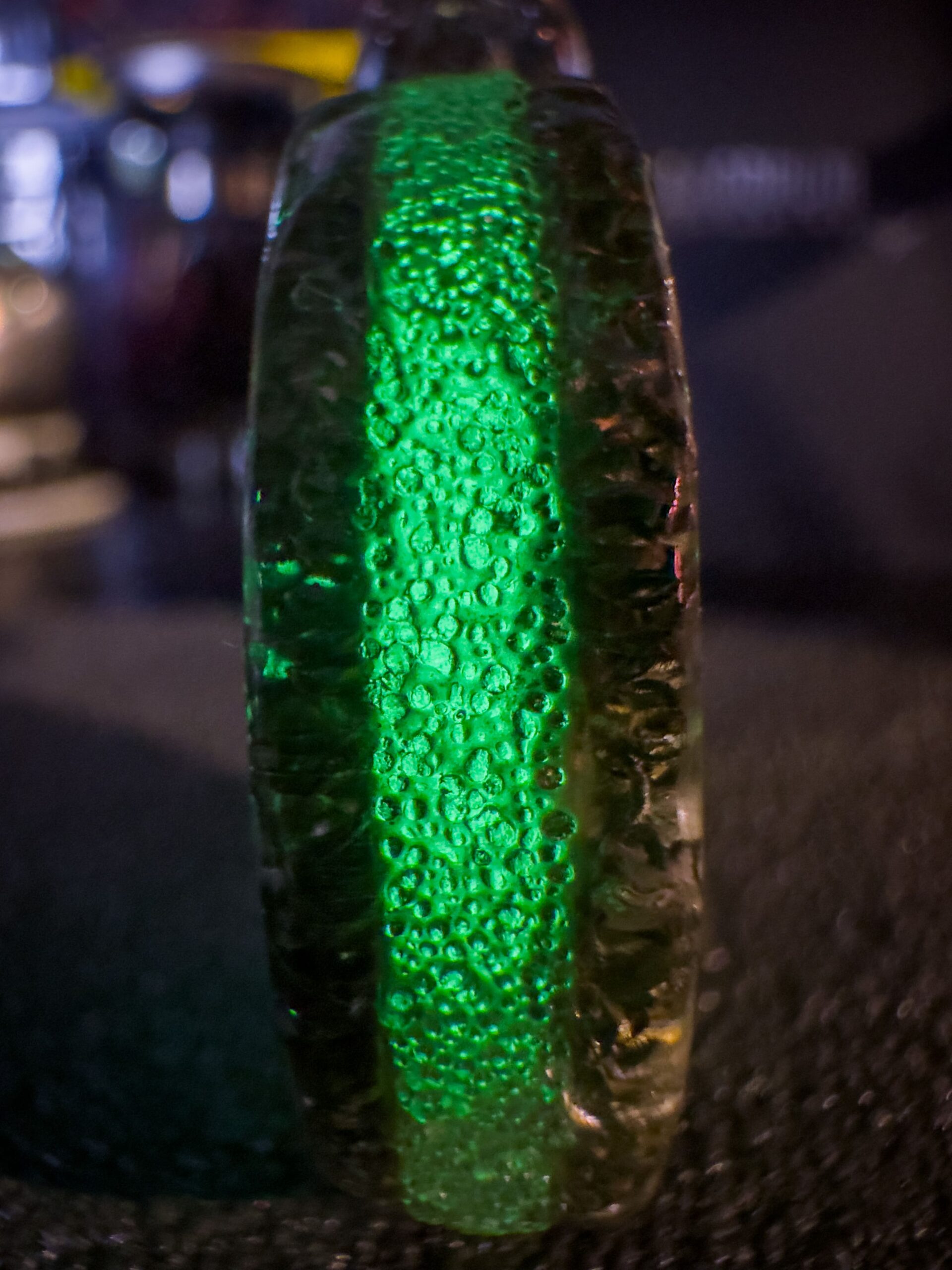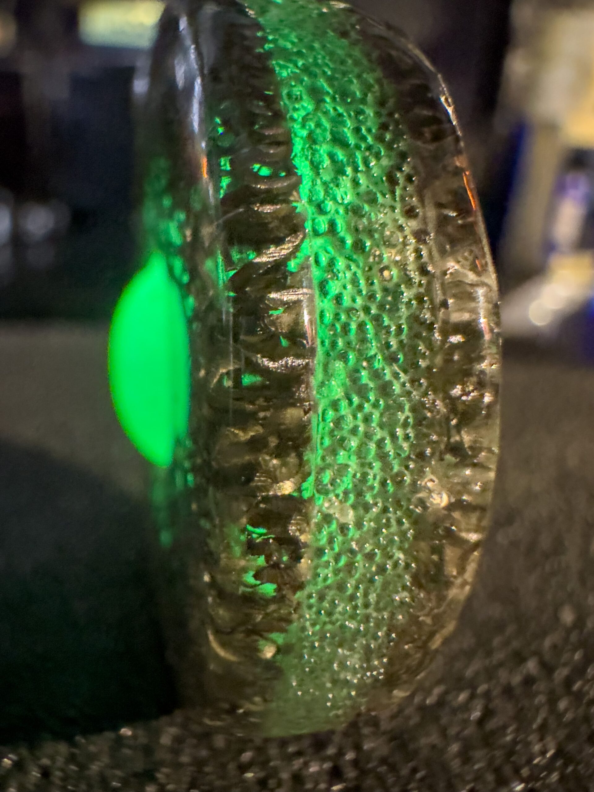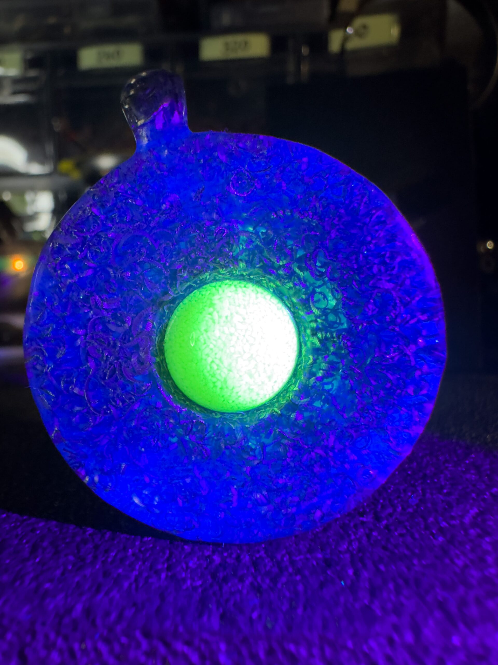 Le due facce del ciondolo, realizzate con truciolo di acciaio Damasco compresso e resina epossidica, custodiscono al loro centro, una sfera di frammenti fosforescenti gialli che si trasformano in un verde intenso al buio, catturando ogni sguardo.
