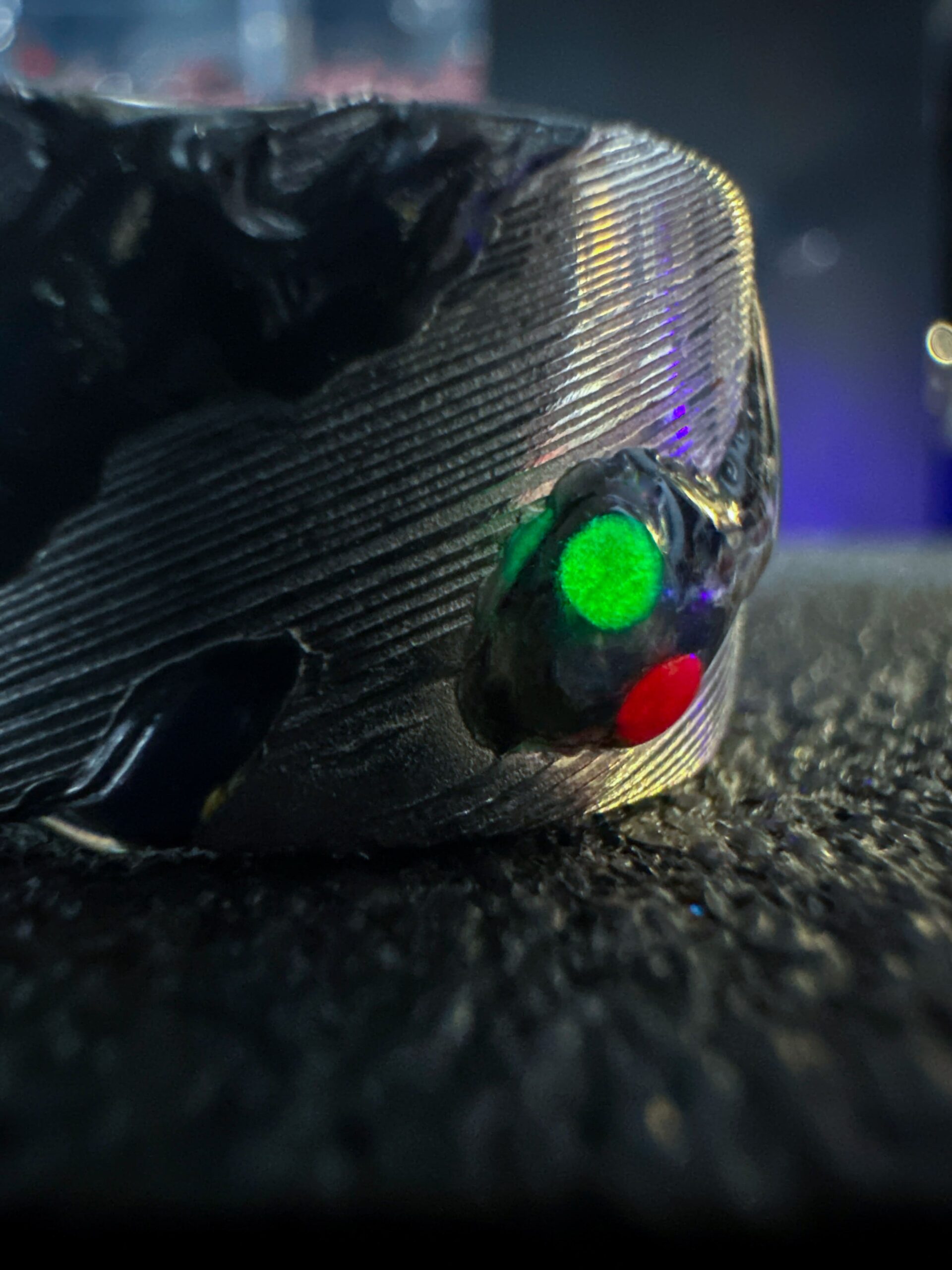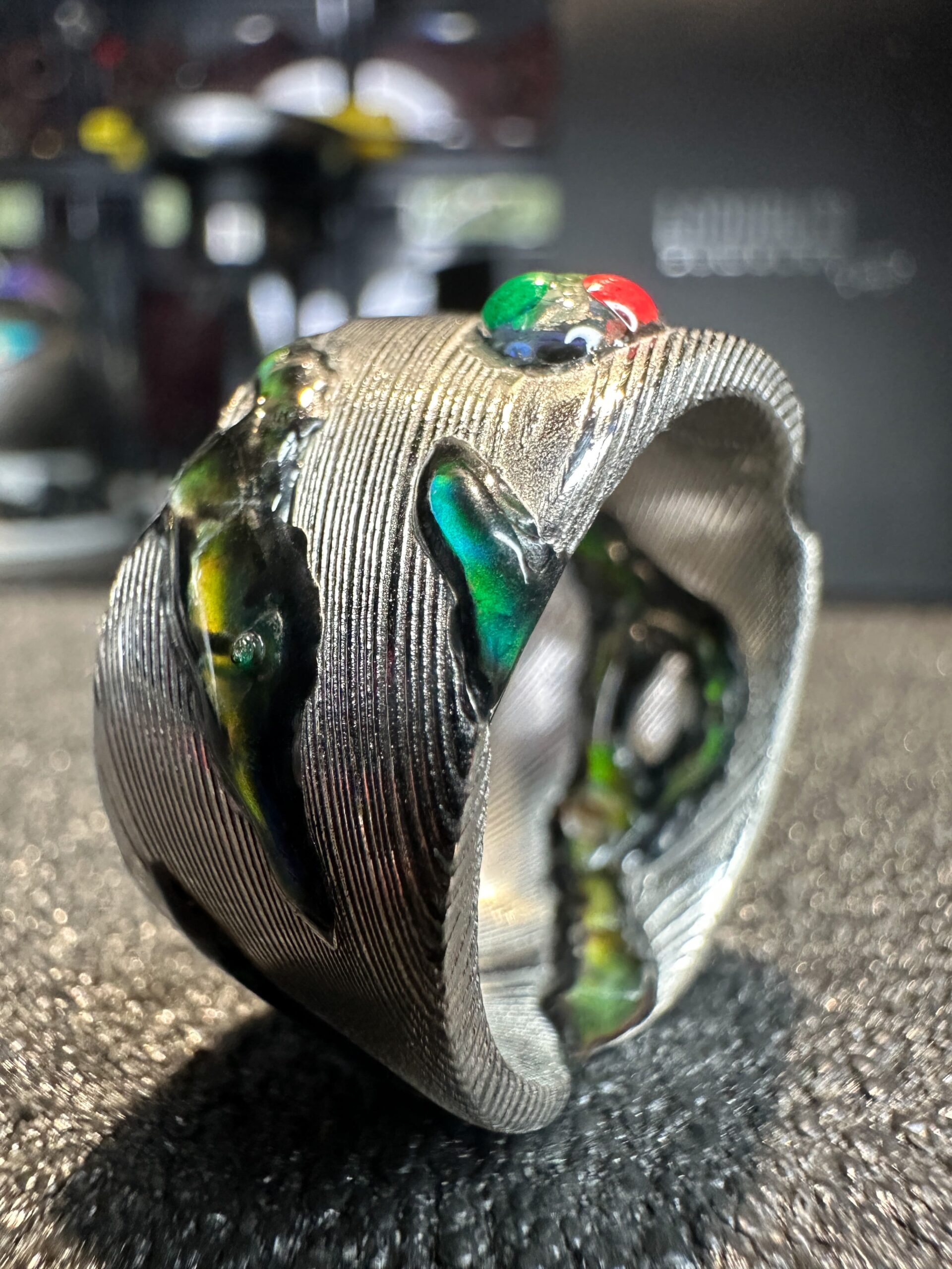 Scolpito internamente ed esternamente con dettagli artistici che richiamano le sue movenze sinuose, questo anello รจ un capolavoro di design. La base nera, reattiva alla temperatura corporea, si abbina perfettamente alla muta di pitone che lo avvolge parzialmente, creando un gioco di luci e ombre straordinario.