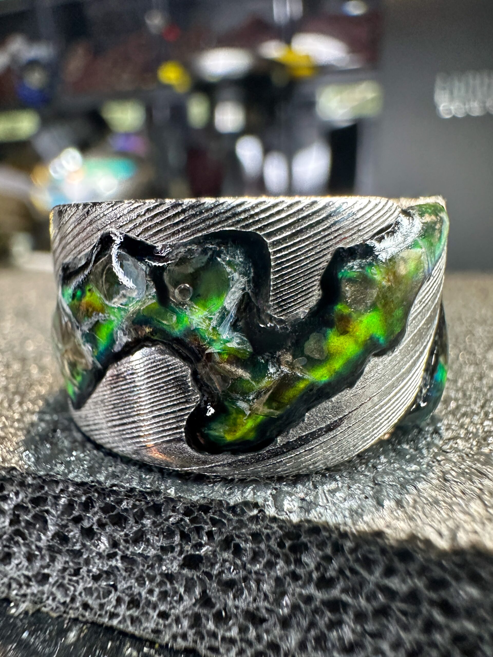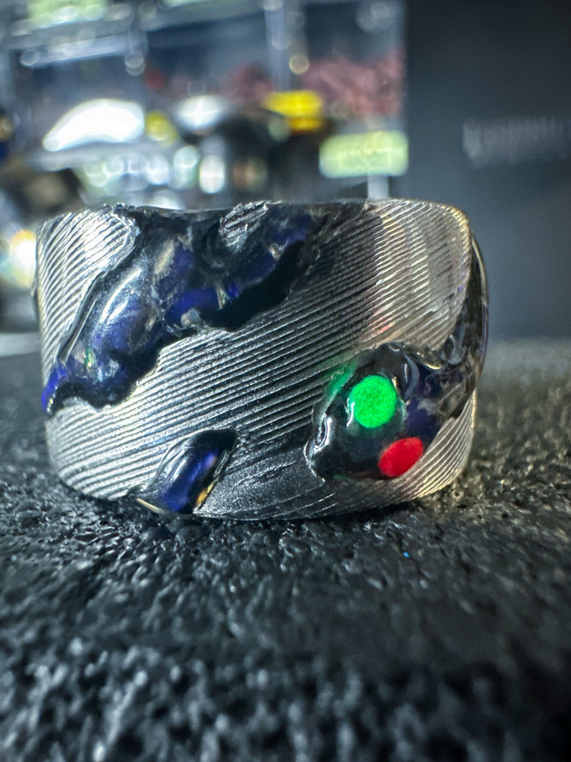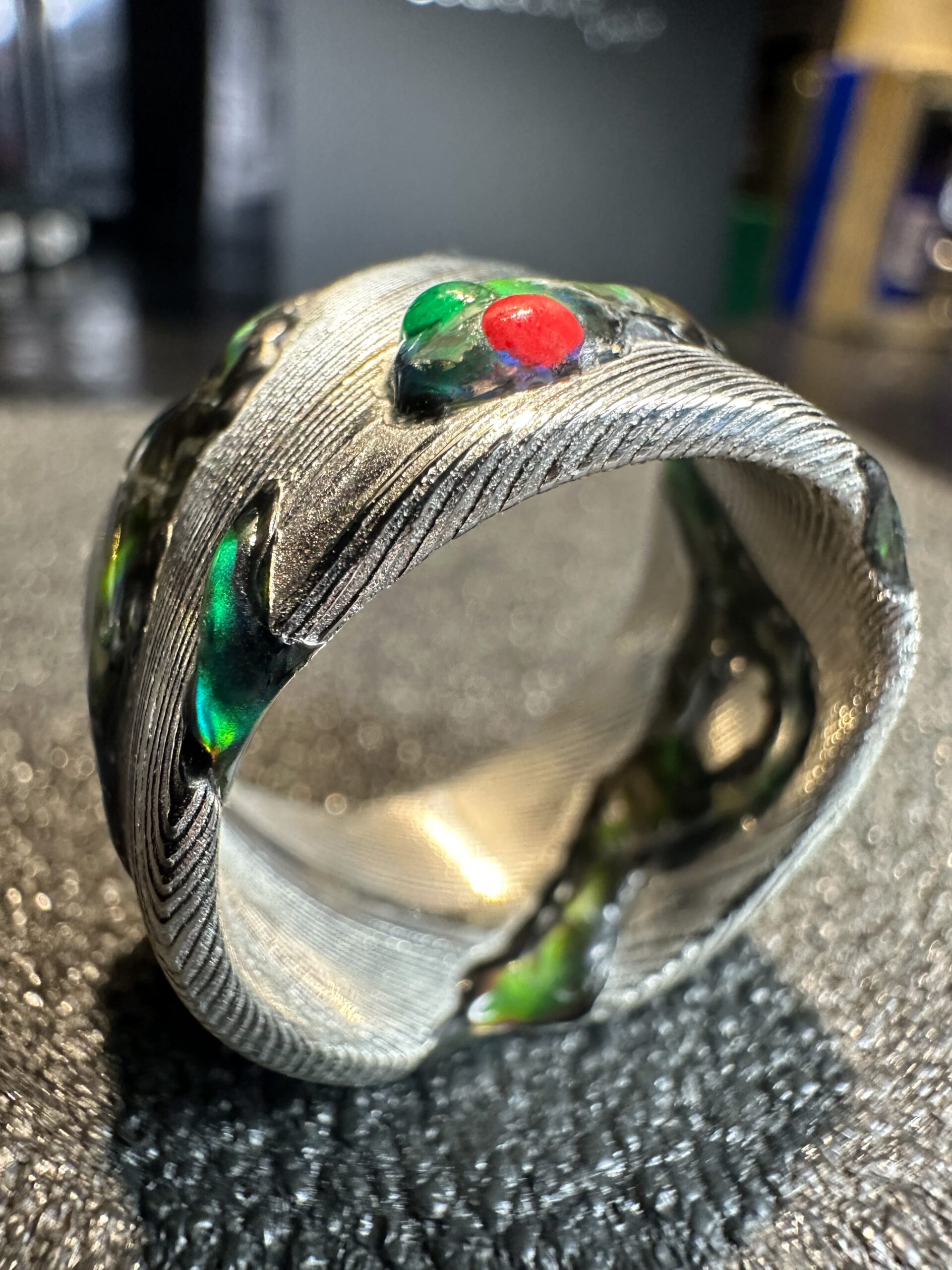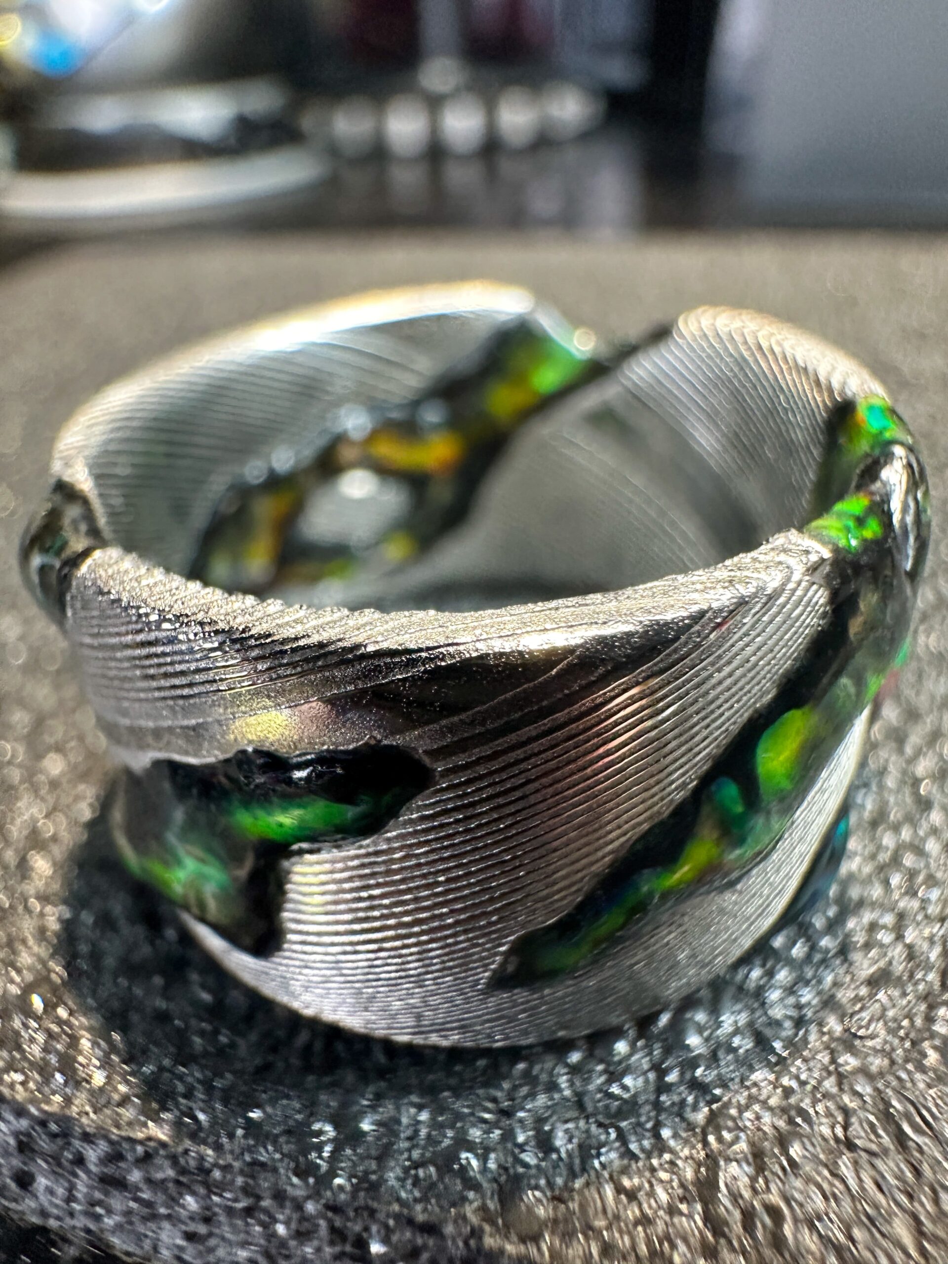 Ogni pezzo รจ unico e lavorato a mano, combinando tradizione e design moderno. Gli anelli, personalizzabili in metalli e finiture, presentano le caratteristiche venature ondulate del damasco, rendendoli robusti e esteticamente affascinanti.