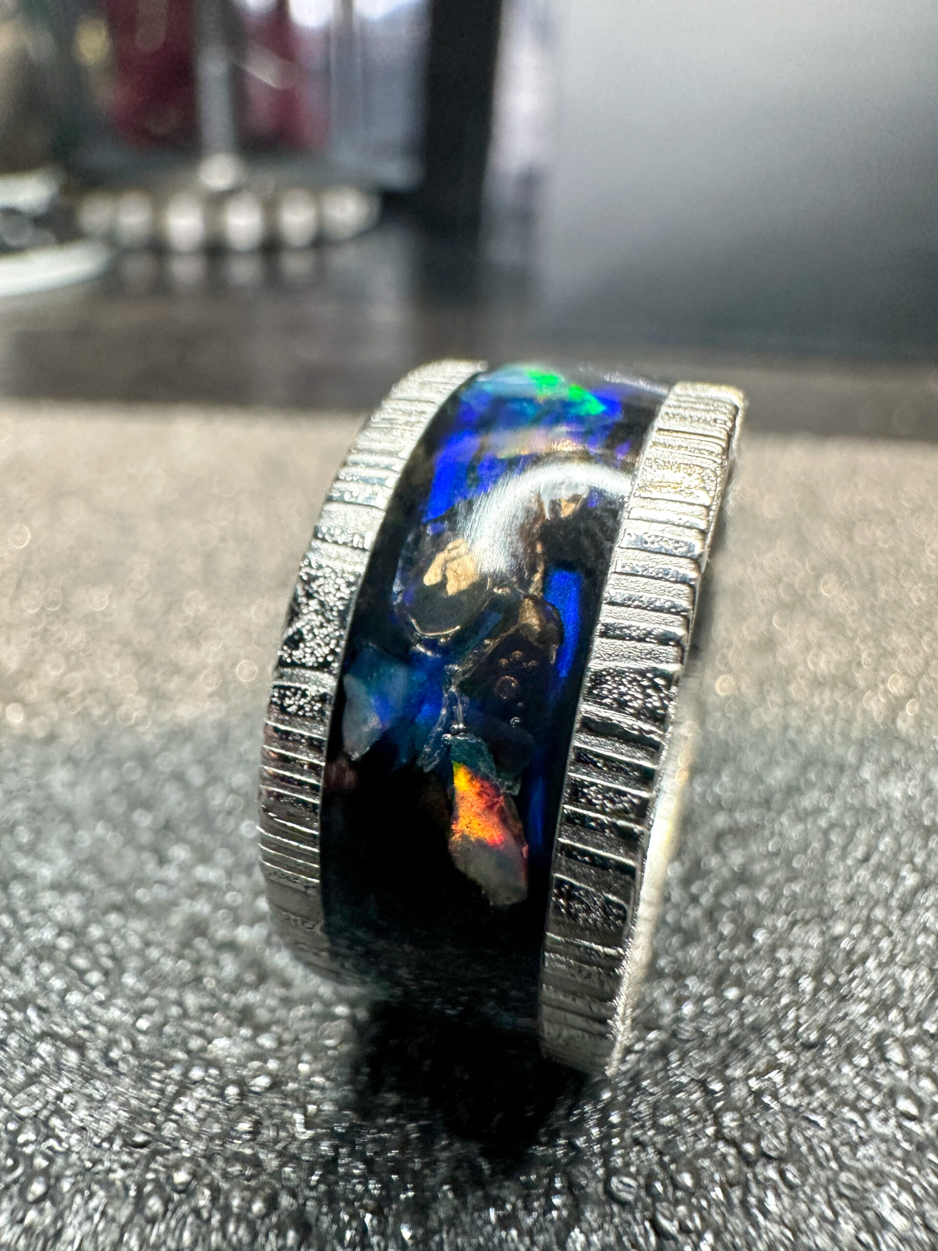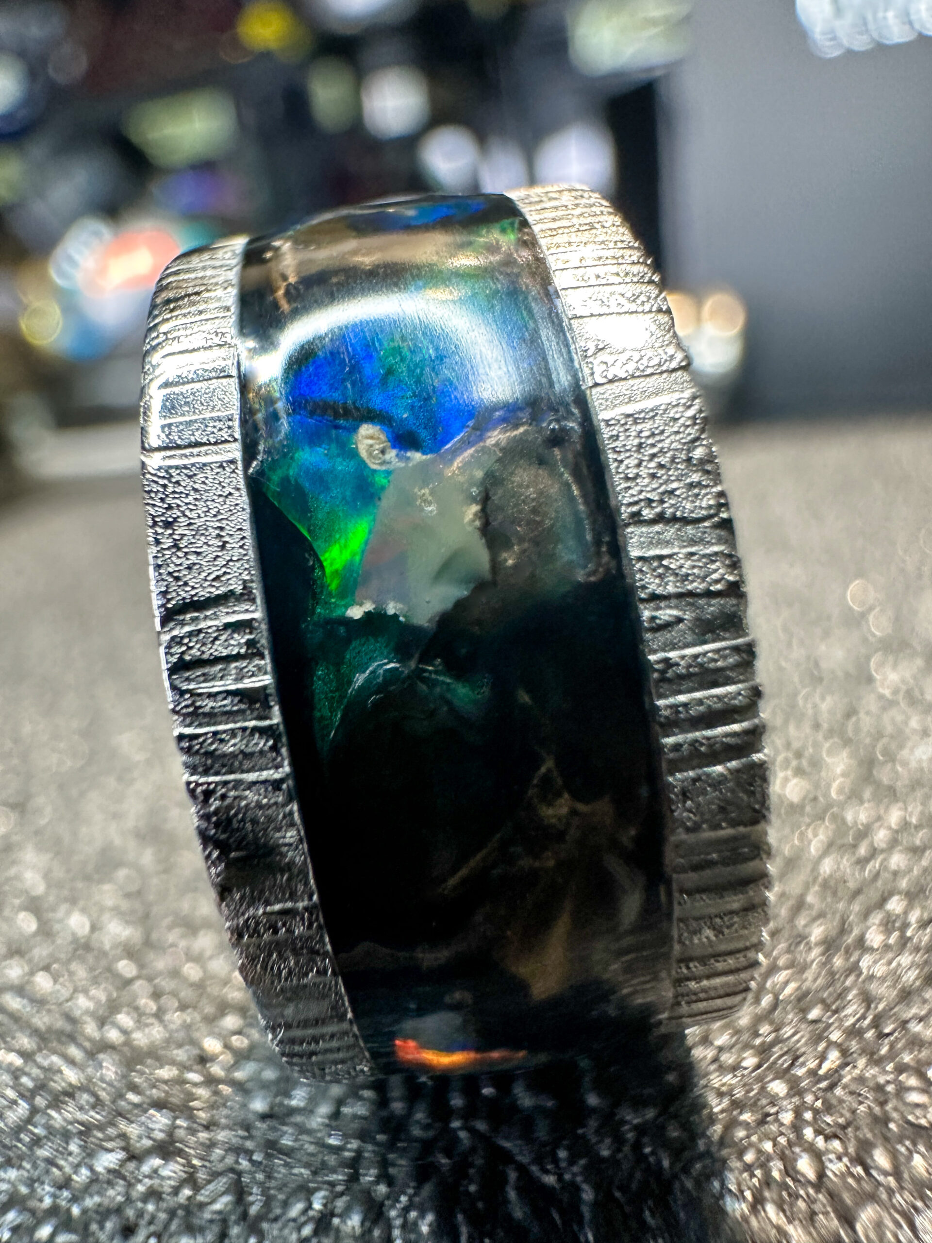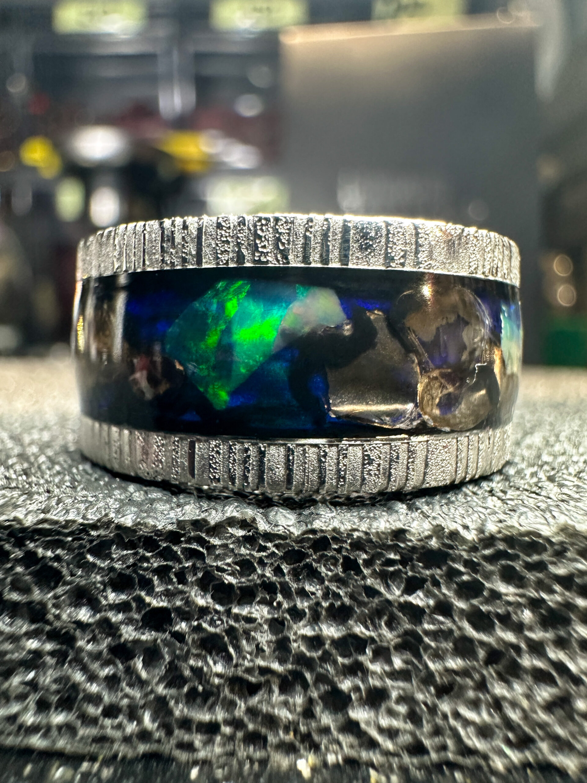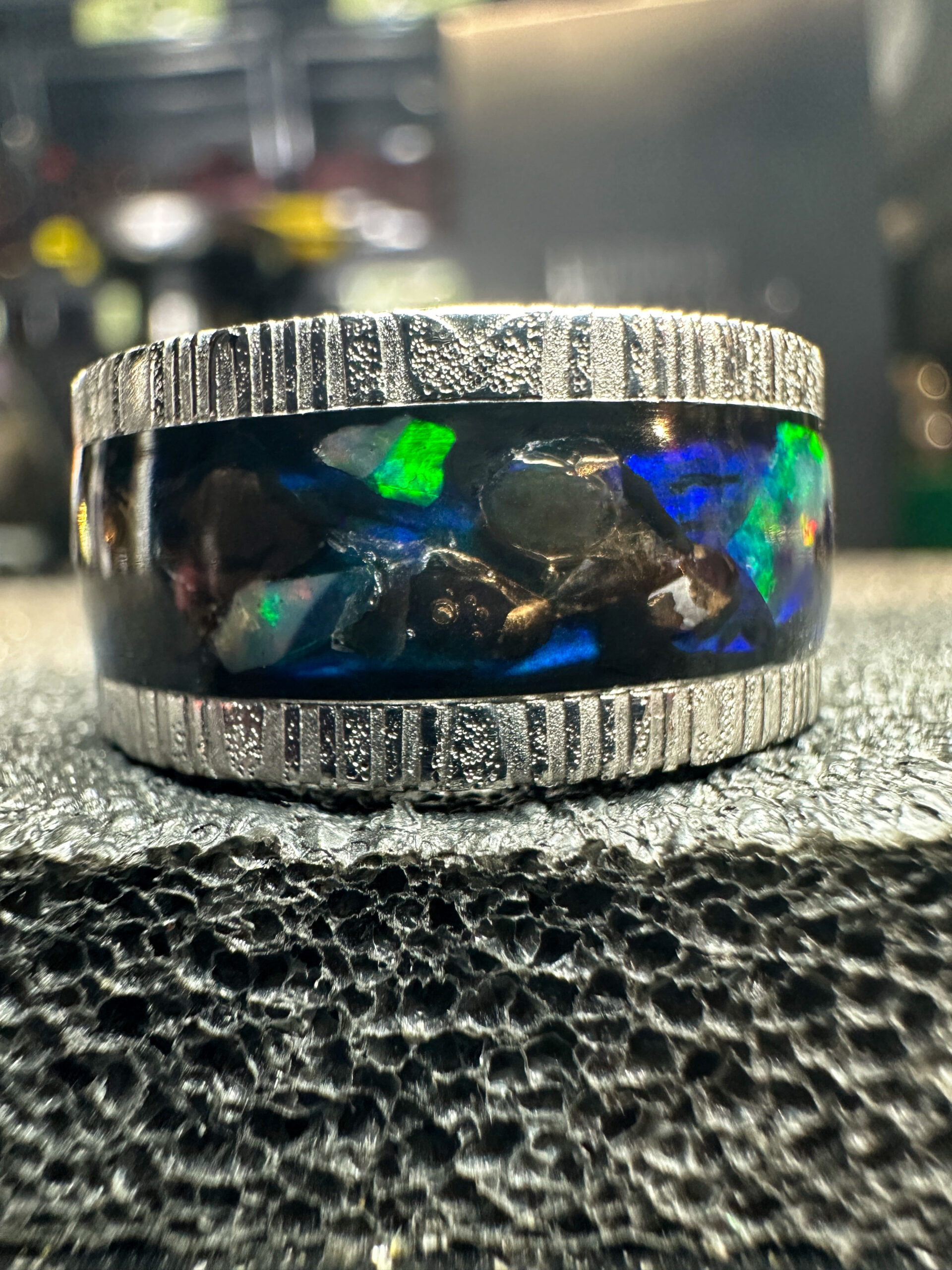 Ma il vero incanto si manifesta attraverso i frammenti di opale naturale provenienti dallโEtiopia accuratamente posizionati, i quali emanano lucentezze straordinarie che variano in base all’angolazione. I colori sembrano ballare e interagire, passando da blu misteriosi a verdi luminosi e riflessi caldi, aggiungendo una dimensione sensoriale unica al tutto!