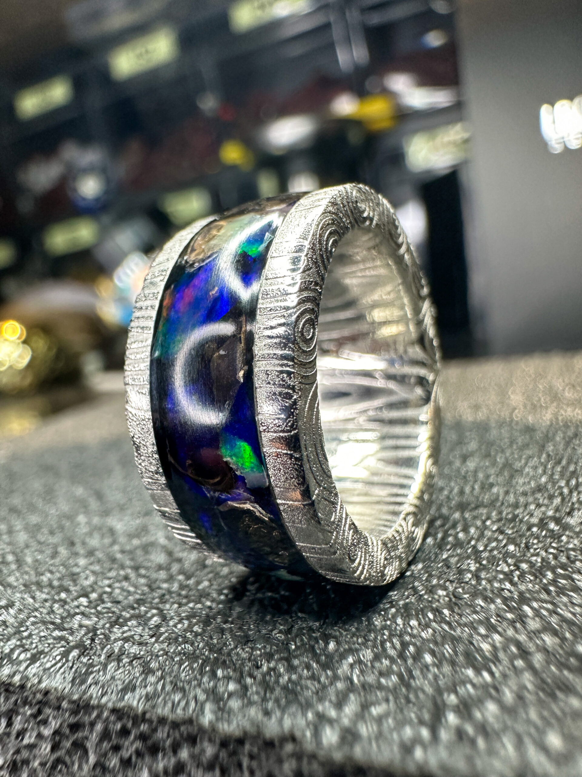 Ogni pezzo รจ unico e lavorato a mano, combinando tradizione e design moderno. Gli anelli, personalizzabili in metalli e finiture, presentano le caratteristiche venature ondulate del damasco, rendendoli robusti e esteticamente affascinanti.